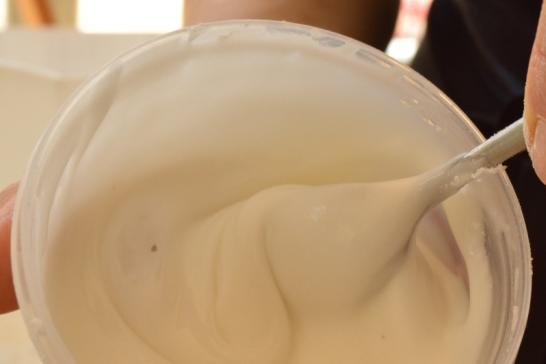 Zum Verzieren fertige ich aus Eiweiß und Puderzucker den Zuckerguss. Dabei ist die Konsistenz der Masse aussschlaggebend. Nicht zu flüssig, aber zu hart darf es auch nicht werden.