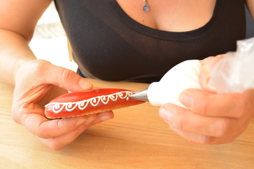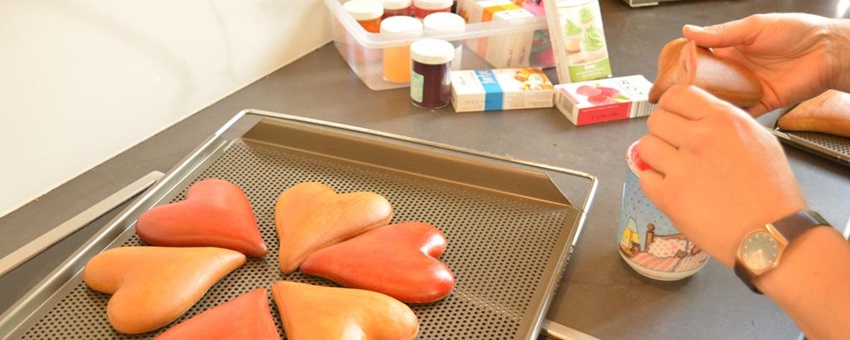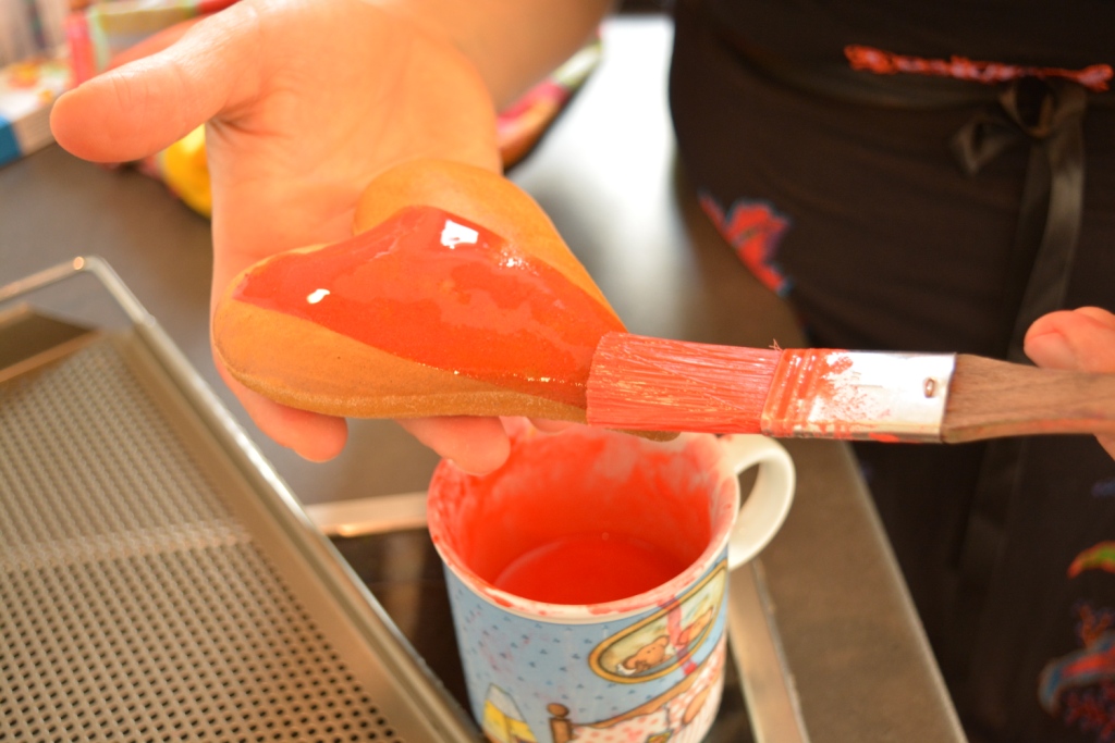 Die fertig getrockneten Kekse können jetzt verziert werden. Dazu bestreicht man sie zuerst mit spezieller Glasur und trocknet sie erneut. Durch den Glanz bekommen die Kekse eine gleichmäßige Oberfläche sowie eine Versiegelung.